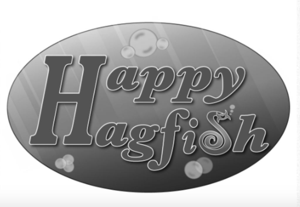 I like the flexibility of the design – if I ever wanted to, I could drop the rest of the “Happy Hagfi-h,” and keep just the Hagfish/S. If I were to render this image in black and white, I would consider removing the blue gradient in the background, but I like how the light appears to shine on the logo. For anyone curious, this is what the design looks like in black and white: