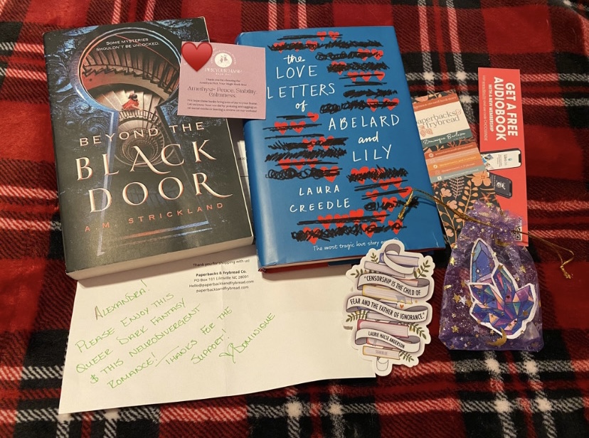 The books I received are “The Love Letters of Abelard and Lily” by Laura Creedle and “Beyond the Black Door” by A.M. Strickland. I’m unfamiliar with these authors, so I did some cursory research. Laura Creedle is a neurodivergent author living in Texas, and A.M. Strickland is a Y.A. Author living in Alaska. My favorite genres include “Romance,” “Science-Fiction,” and “Spooky Books With Children Protagonists Who Face Scary Circumstances But Everything Ends Happily,” so I’m very pleased with my books!