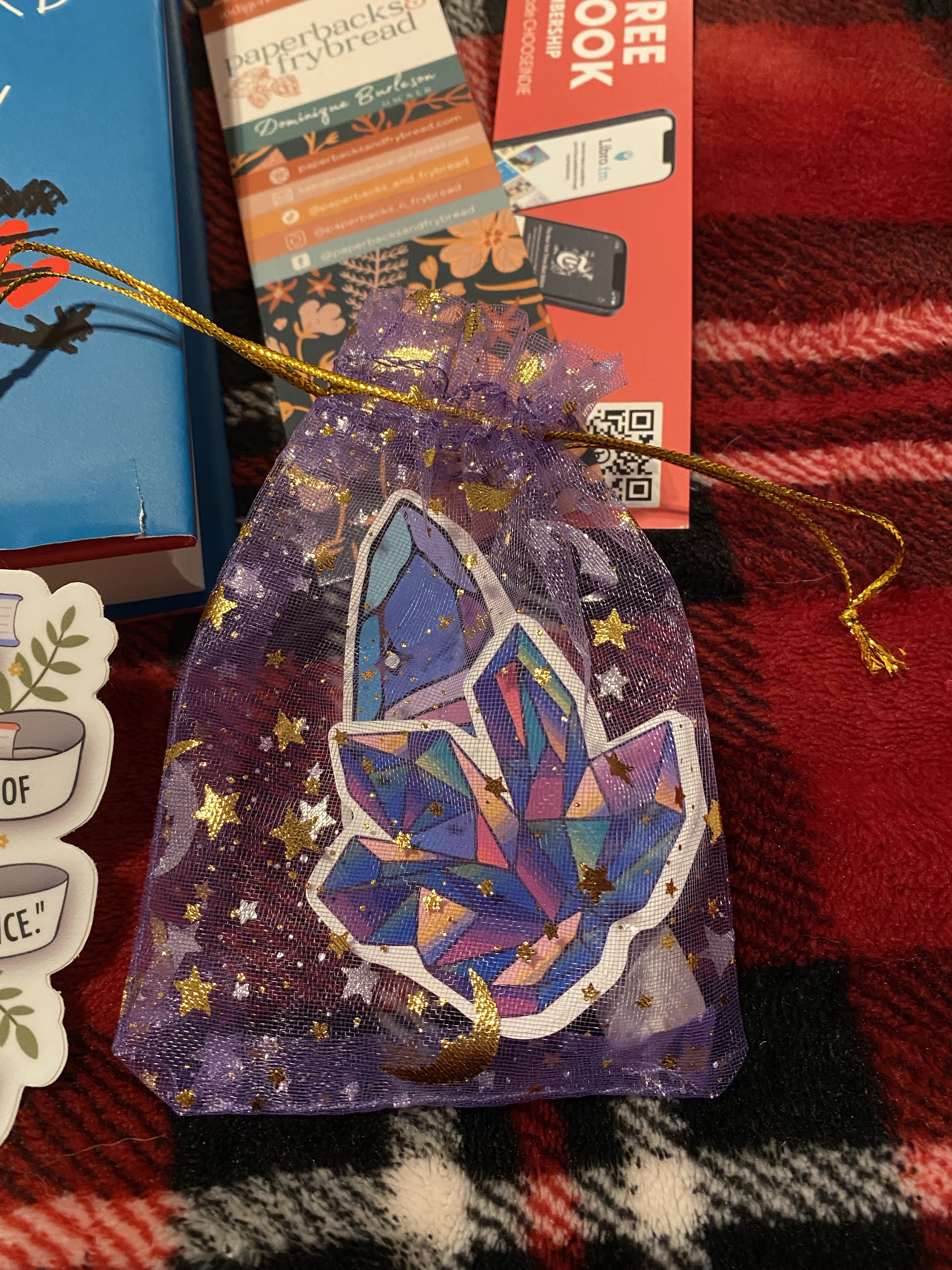 I received not one but two books in my Amethyst box, the sticker I ordered, bookmarks, a little bag containing more stickers and a cute little amethyst, and a hand-written note describing my books! (The note is addressed with my real name, Alexandra, because my mother did not gestate me for nine months just to name me “Miss Posabule” or “Hagfish.”)