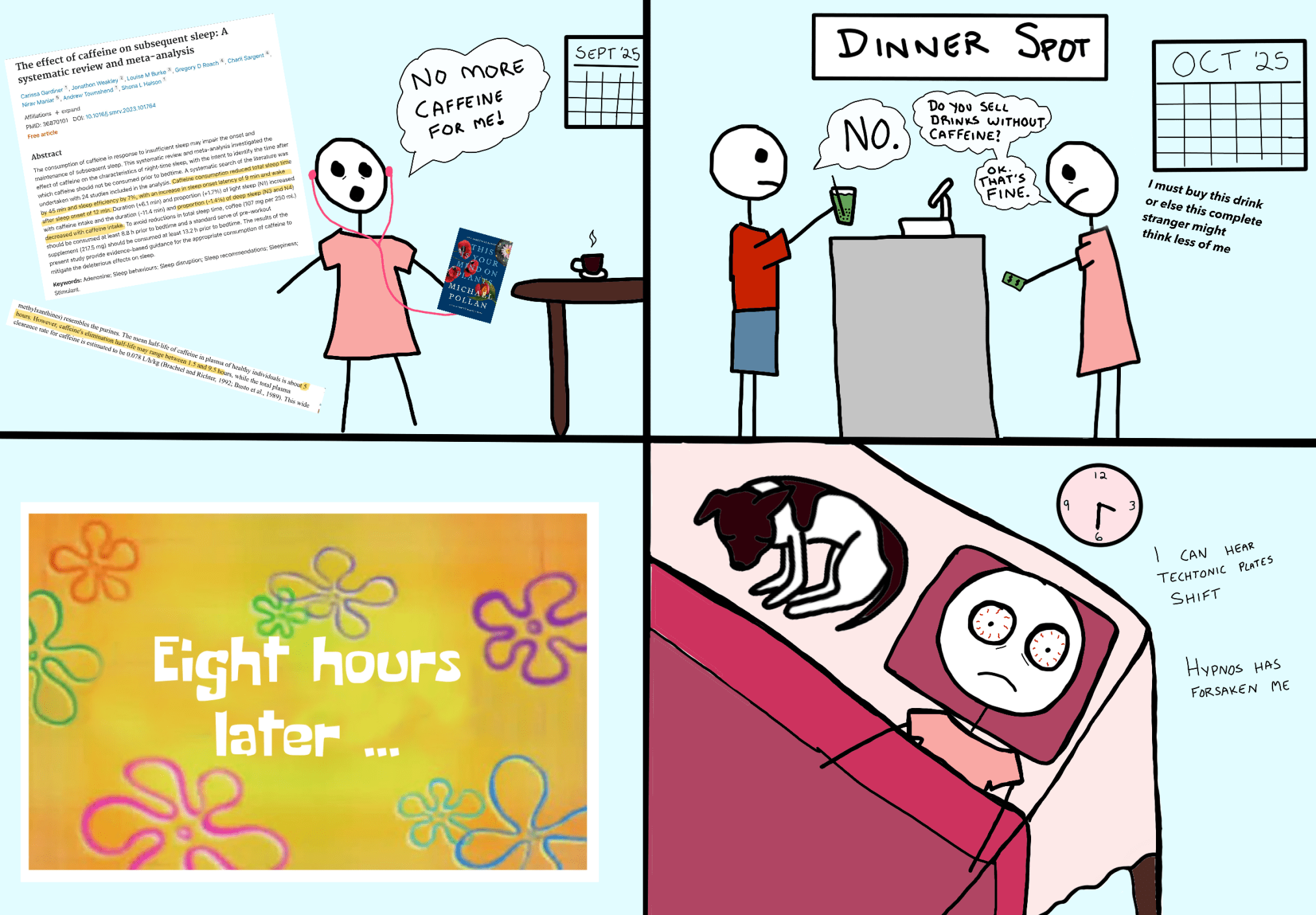The chapter on caffeine was particularly illuminating, and Pollan’s description made it sound almost like a miracle drug for its ability to awaken and energize the people who consume it (either via coffee, tea, or some other mixture). Unfortunately, I’ve had a few very bad nights of sleep. When I learned that caffeine can take a surprisingly long time to leave your system, thus interfering with your sleep quality, I decided to cut it out of my life as an experiment.